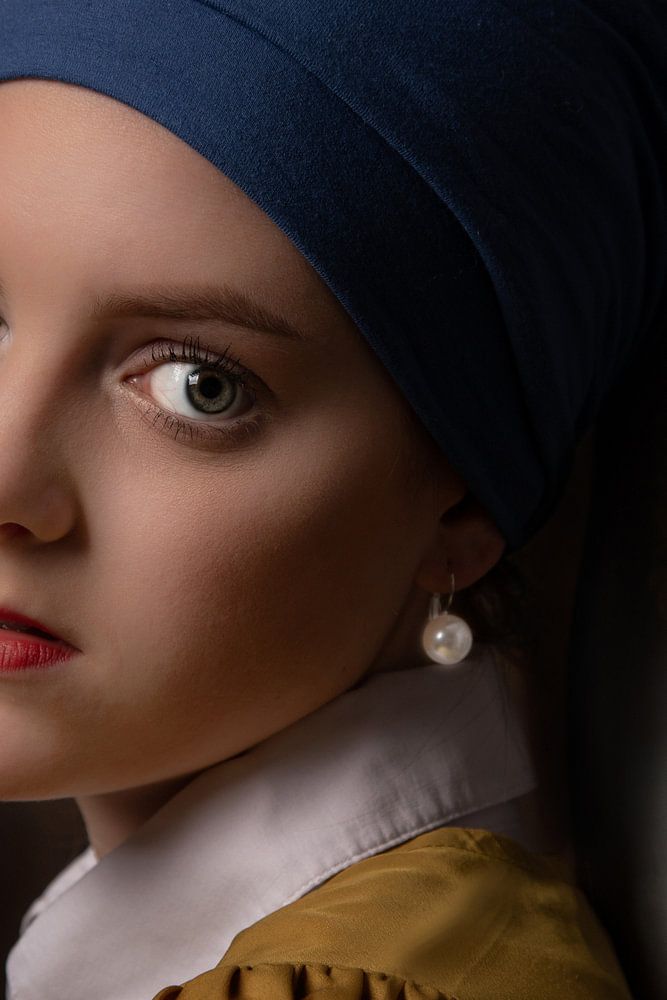 Je voulais photographier ma fille comme la fille de Vermeer. L'écharpe en soie vient de mon père (78 ans) quand il était adolescent. Imprimé sur papier reliquaire dans un cadre ancien, celui-ci est magnifique.