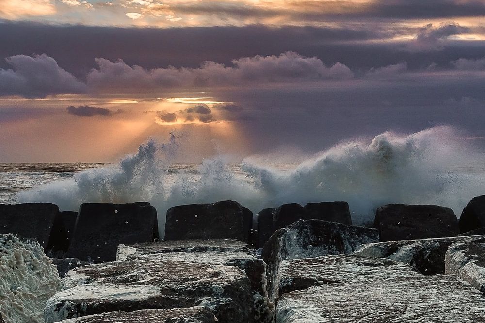 Sur la côte néerlandaise, près du Maasvlakte, un magnifique coucher de soleil rencontre une tempête en approche.