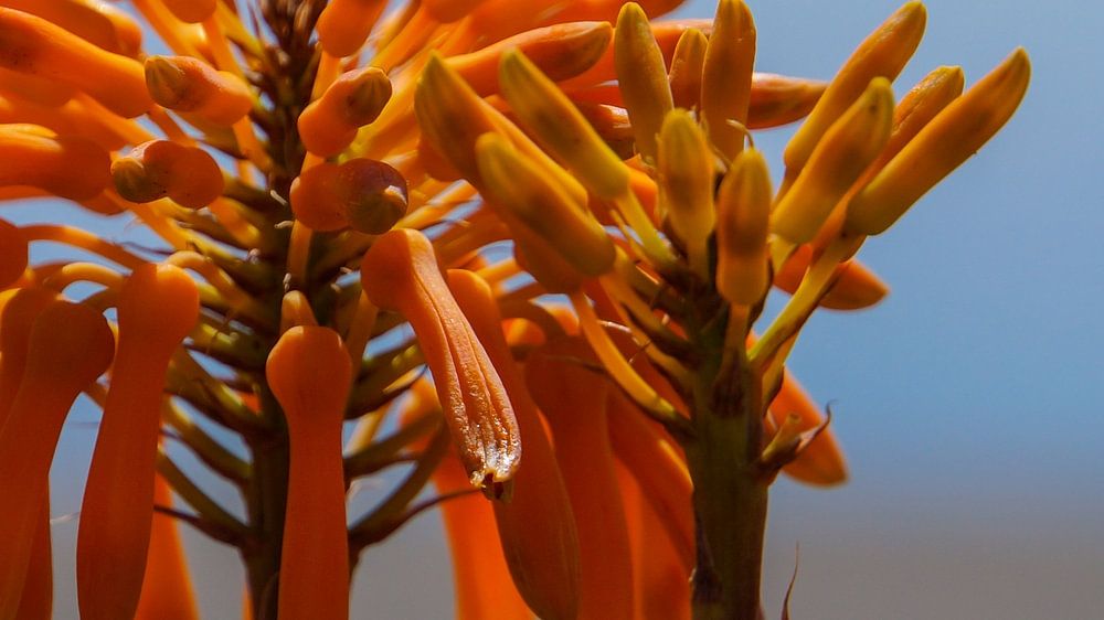 Madeira - Fleur d'Aloe Vera à floraison orange avec de grandes fleurs à la lumière chaude du soleil