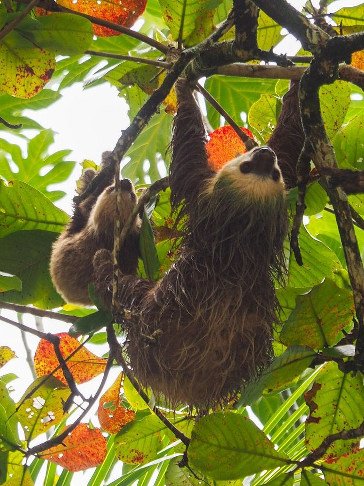 Vous vous promenez derrière votre hôtel pendant un moment. Soudain, vous entendez quelque chose au-dessus de vous. Que voyez-vous, une maman paresseuse et son petit grimpent tranquillement jusqu'à l'arbre le plus proche. Vous voyez que la mère est encore complètement mouillée par l'averse de tout à l'heure et vous pouvez aussi voir les algues sur ses cheveux.
