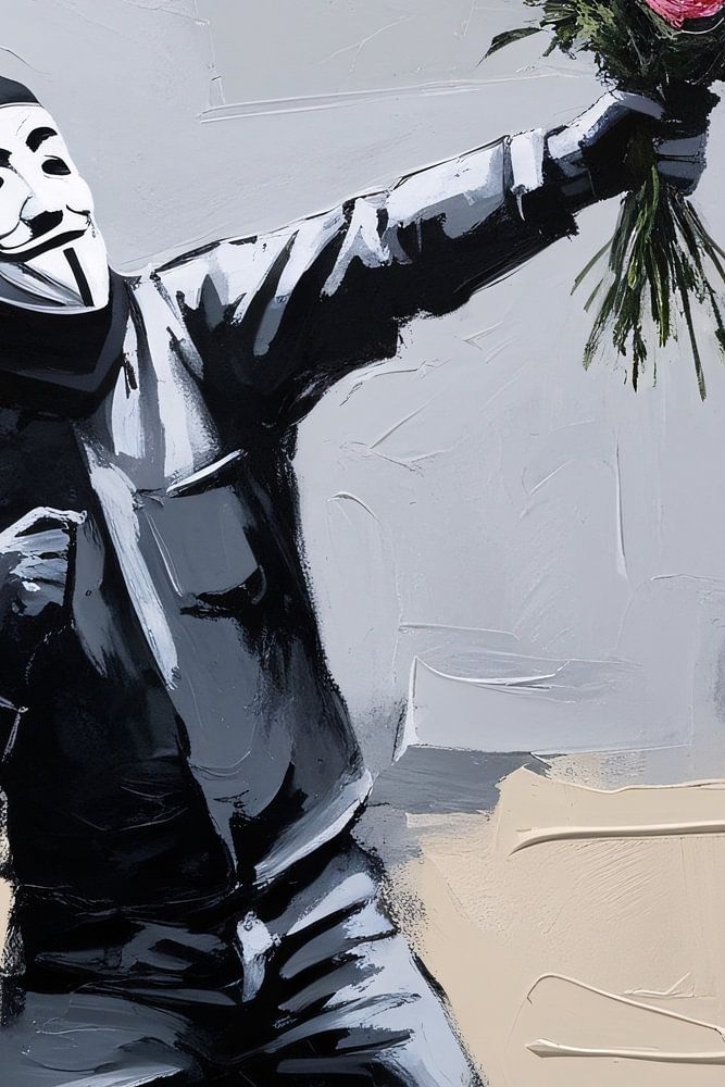 Cette œuvre d'art moderne représente un personnage masqué lançant un bouquet de fleurs. L'image combine force et vulnérabilité, opposant les fleurs, symbole de paix, à l'attitude de protestation. Le tableau attire un large public grâce à ses éléments reconnaissables et à sa palette de couleurs contrastées. Elle s'intègre parfaitement dans un intérieur moderne ou s'affiche sur le mur d'un salon ou d'un bureau. L'artiste associe l'art de la rue et l'activisme, donnant à cette œuvre un message unique d'espoir et de rébellion. Elle attire l'attention et invite à la réflexion sur des thèmes tels que la liberté et la paix.