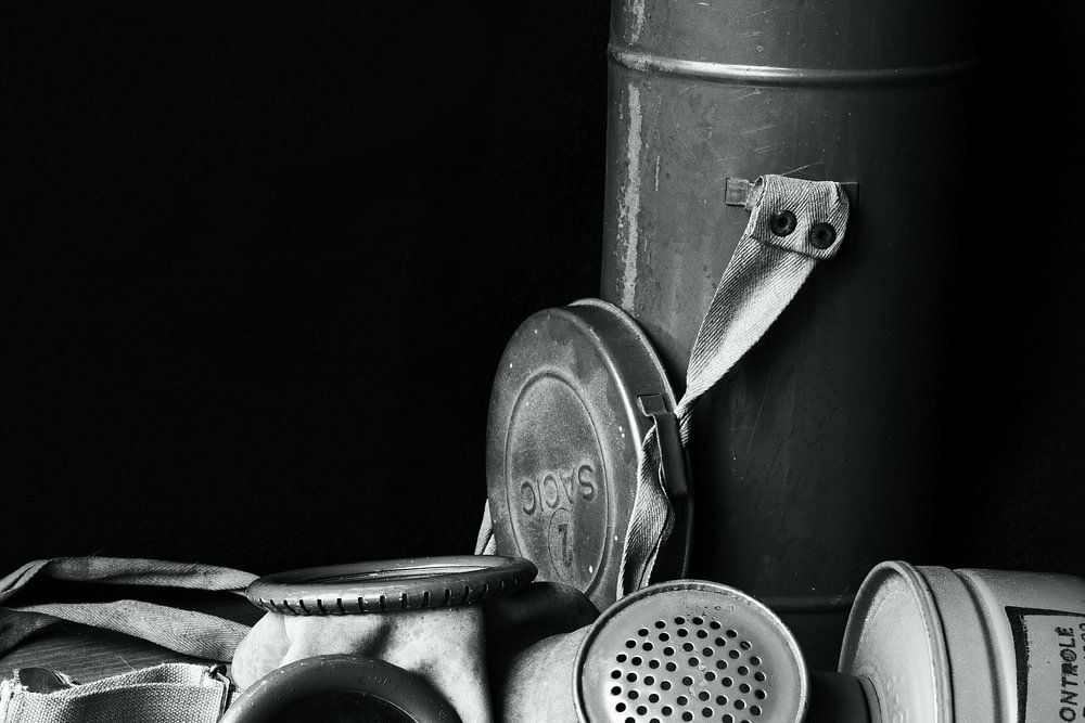 Nature morte d'un masque à gaz civil de la seconde guerre mondiale en noir et blanc. Masque à gaz standard utilisé en Belgique pendant la guerre. Il est photographié avec son tube métallique d'origine, sur une table en bois, éclairé sur le côté et sur fond sombre.