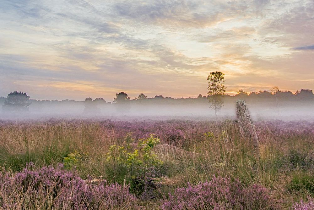 Admirez la beauté enchanteresse des dunes de Drunense au lever du soleil, où la bruyère est en pleine floraison et où une brume mystérieuse plane sur le paysage. Laissez-vous séduire par la paix et la sérénité de cette scène à couper le souffle. Parfait pour les amoureux de la nature.