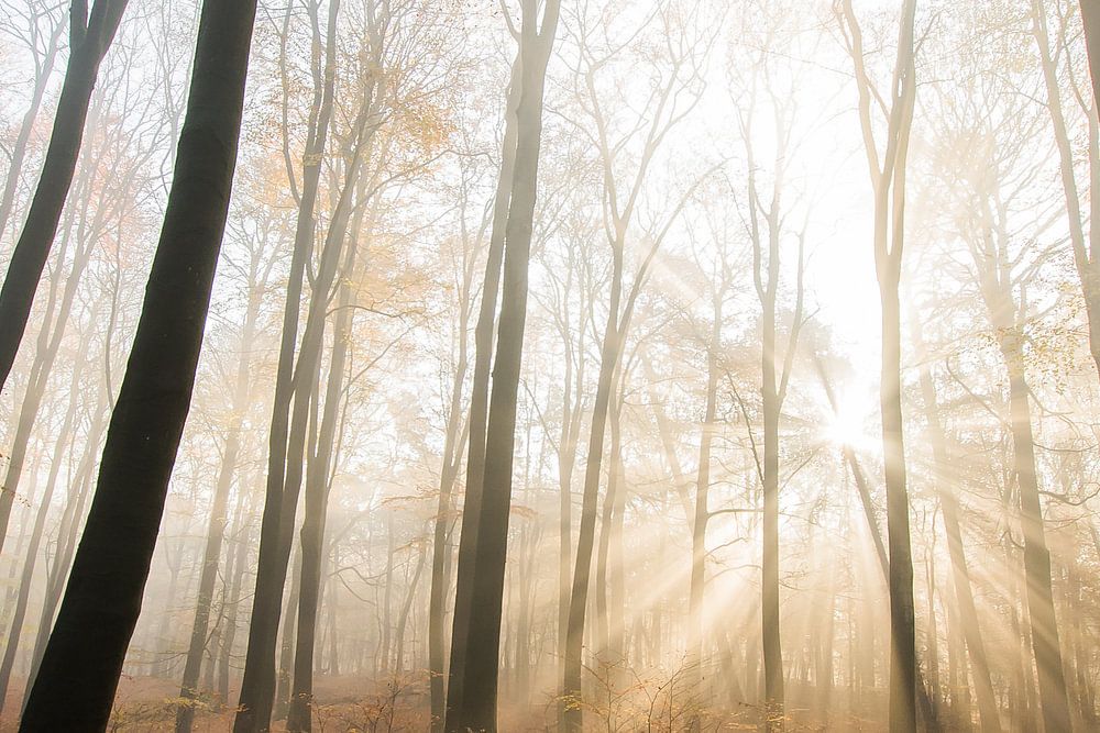 Une belle matinée d'automne sur le Veluwezoom. C'était une journée froide et les dernières feuilles étaient encore accrochées aux arbres. Le soleil bas a apporté de belles harpes solaires dans la forêt.