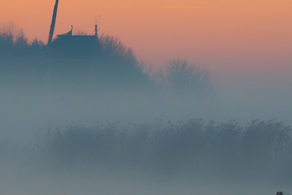 Un lever de soleil froid et brumeux mais beau en automne dans l'Alblasserwaard