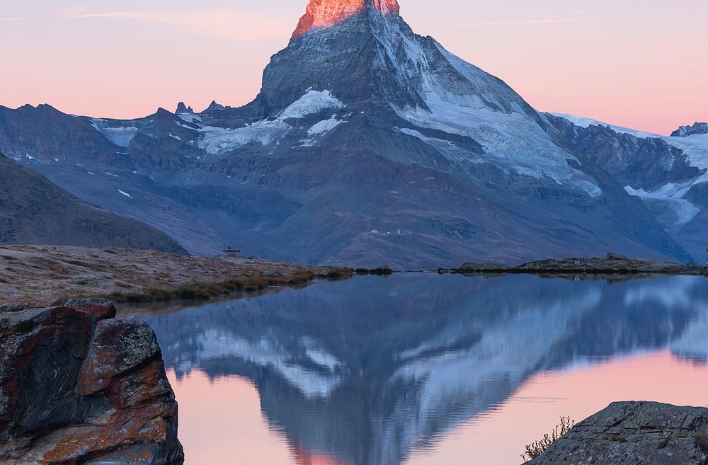 Le Cervin reflétée dans le Stellisee lors de la première lumière du soleil sur le dessus.