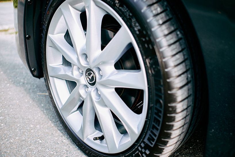 Dans cette image finale de la série, l'accent est mis sur un élément qui est souvent négligé - et qui pourtant porte tout : la roue. L'étoile de jante argentée avec le logo Mazda trône fièrement au centre, entourée du profil puissant d'un pneu Michelin. Chaque rayon semble être une promesse de mouvement, de fiabilité sur toutes les routes.