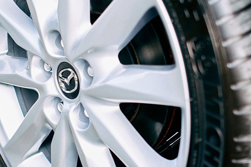 Dans cette image finale de la série, l'accent est mis sur un élément qui est souvent négligé - et qui pourtant porte tout : la roue. L'étoile de jante argentée avec le logo Mazda trône fièrement au centre, entourée du profil puissant d'un pneu Michelin. Chaque rayon semble être une promesse de mouvement, de fiabilité sur toutes les routes.