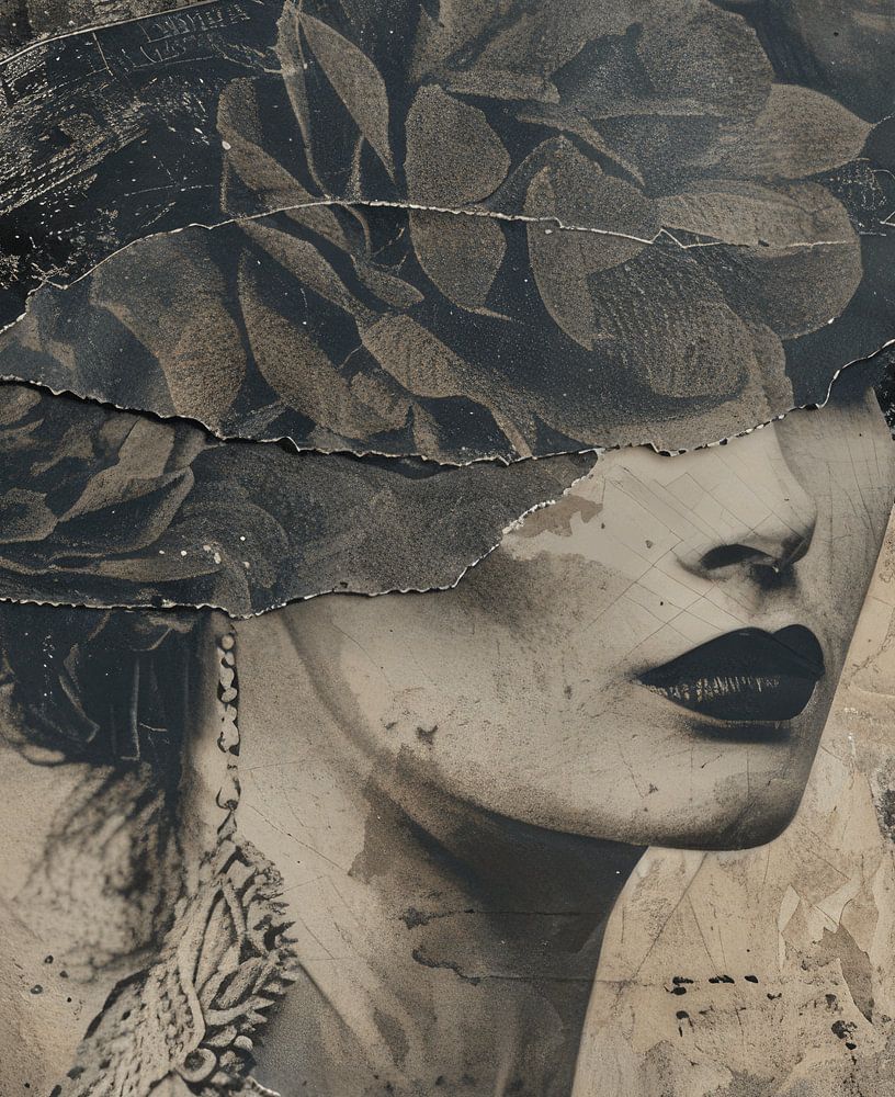 Mixed media portrait vintage, jeune femme portant un chapeau. Choisissez la taille et la matière de cette œuvre et faites en sorte qu'elle s'adapte à votre intérieur.