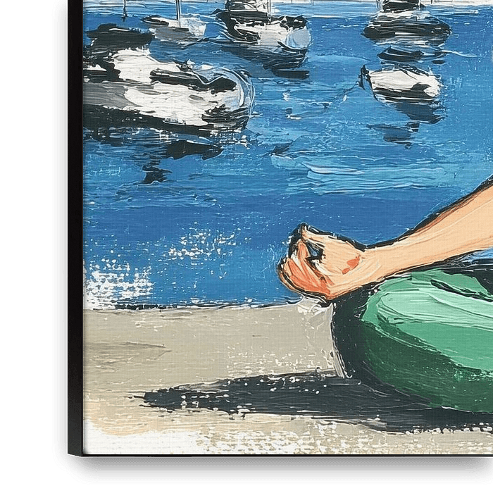 Femme Méditation | Soleil Méditation au bord de la mer - Cette peinture montre une femme en position de méditation, portant une boucle d'oreille en or, assise et détendue sur la toile de fond sereine d'un paysage côtier avec des bâtiments colorés et des voiliers.