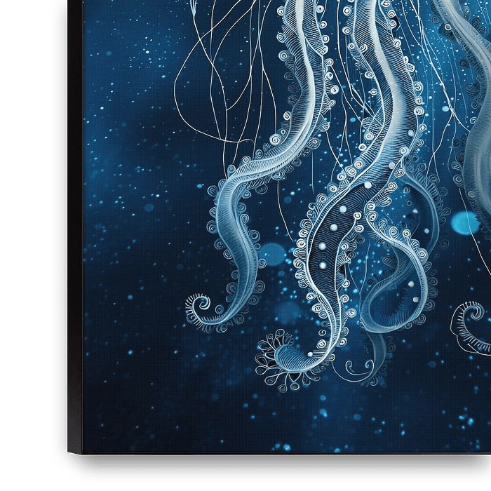 Une méduse inspirée du bleu de Delft, flottant dans les sombres profondeurs de la mer du Nord. L'élégance de la mer, racontée en coups de pinceau numériques. Une ode moderne à la beauté intemporelle avec un look futuriste.