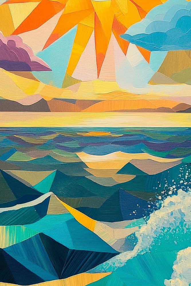 Des rayons de soleil lumineux traversent une mer de nuages excitante et se reflètent sur les vagues dynamiques de l'océan. Les couleurs harmonieuses et les formes géométriques éveillent immédiatement la joie de vivre. Cette œuvre d'art captivante apporte une fraîcheur et une énergie maritimes dans chaque salon et crée une atmosphère accueillante qui invite à la détente.