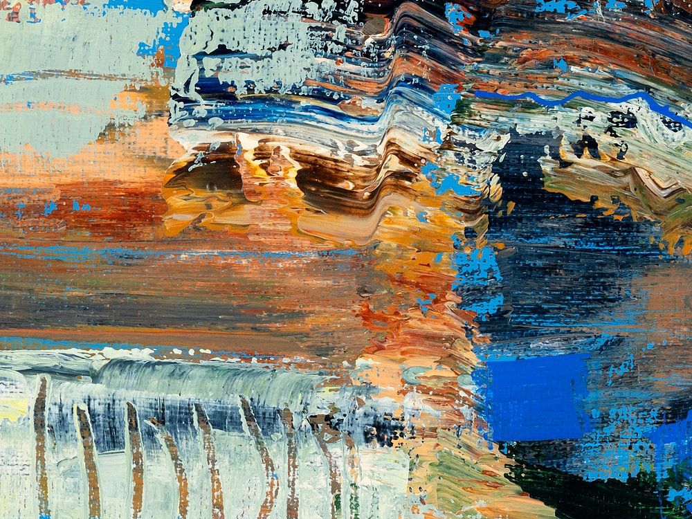 Peinture abstraite avec des couleurs bleu et sable, différentes couches et textures. Les sources d'inspiration sont la mer, la terre, le mouvement, les courants et un sentiment de liberté.