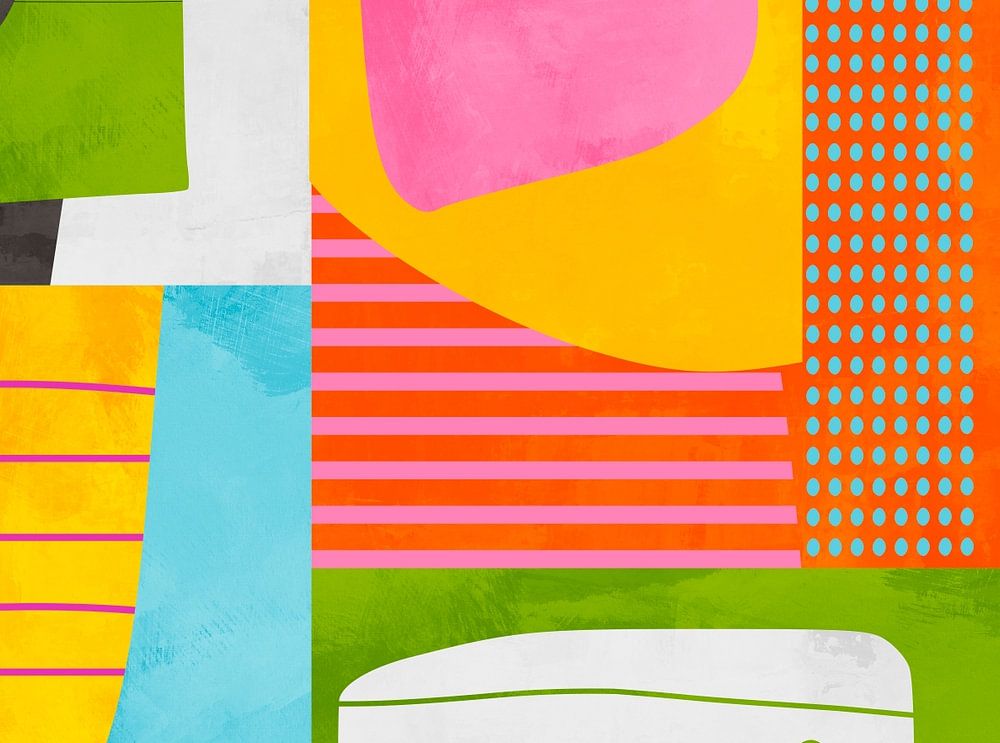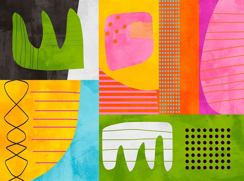 Mid Century Modern Color Burst is a playful abstract artwork with bold blocks of lime green, hot pink, tangerine, yellow, and aqua. Organic shapes and panels mix with mid-century patterns—polka dots, stripes, and hand-drawn squiggles—set against a softly textured background. The mood is upbeat and graphic, perfect for a living room…