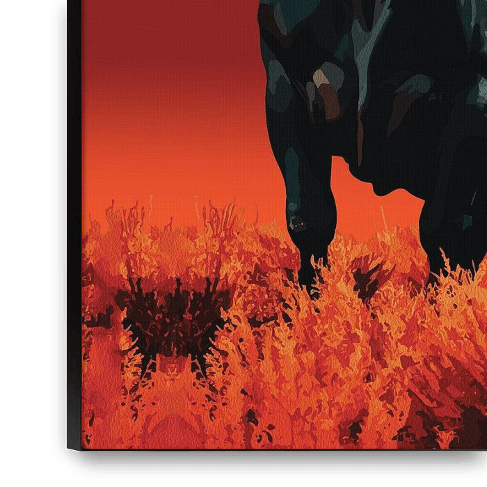 Attirez l'attention avec Midnight Fury, une œuvre d'art murale audacieuse et ardente représentant un puissant taureau noir se tenant droit sous une pleine lune rougeoyante, sur une toile de fond rouge-orange flamboyante. Le contraste surréaliste entre la force sombre et la passion brûlante évoque la domination, la résilience et…