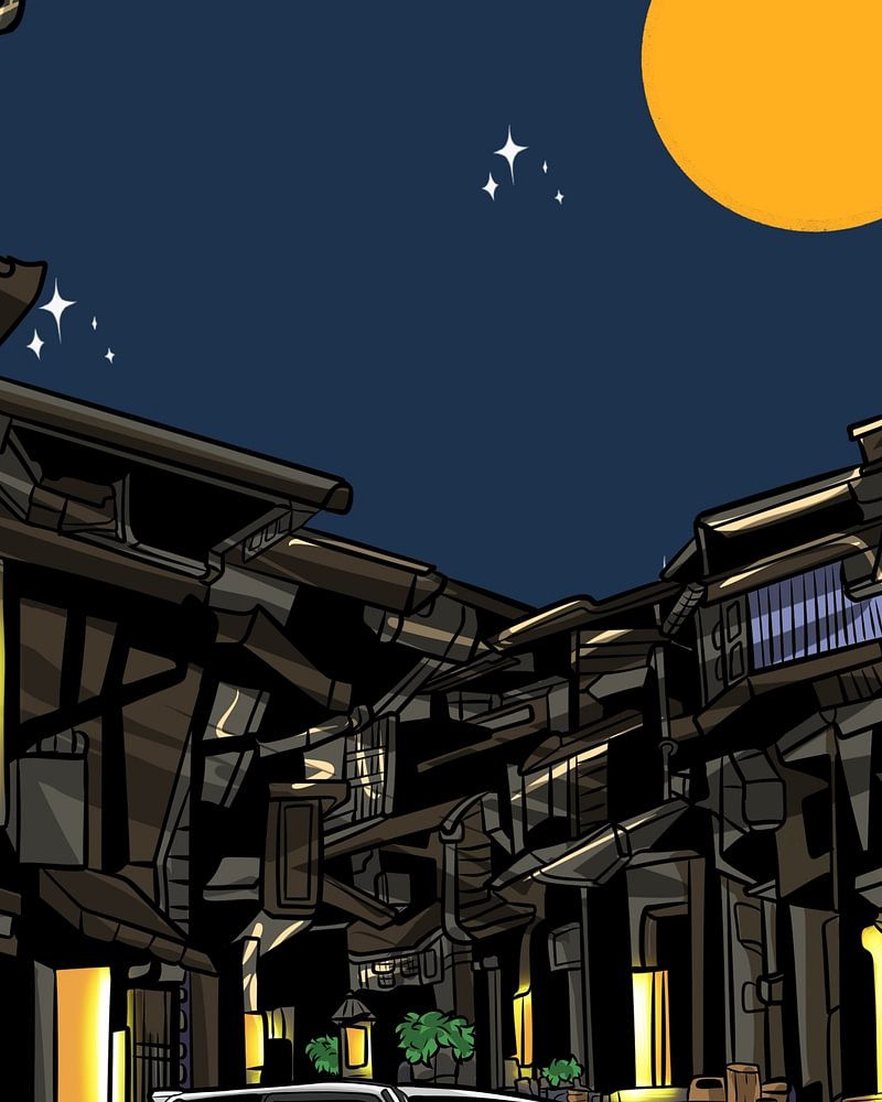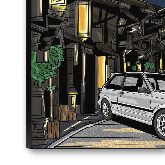 Plongez dans un paysage nocturne à la fois serein et puissant, où la tradition rencontre l'adrénaline. Cette œuvre d'art capture un hatchback turbo rétro illuminé par la lueur chaude d'une lanterne, mêlant la beauté architecturale japonaise aux détails raffinés de l'automobile.