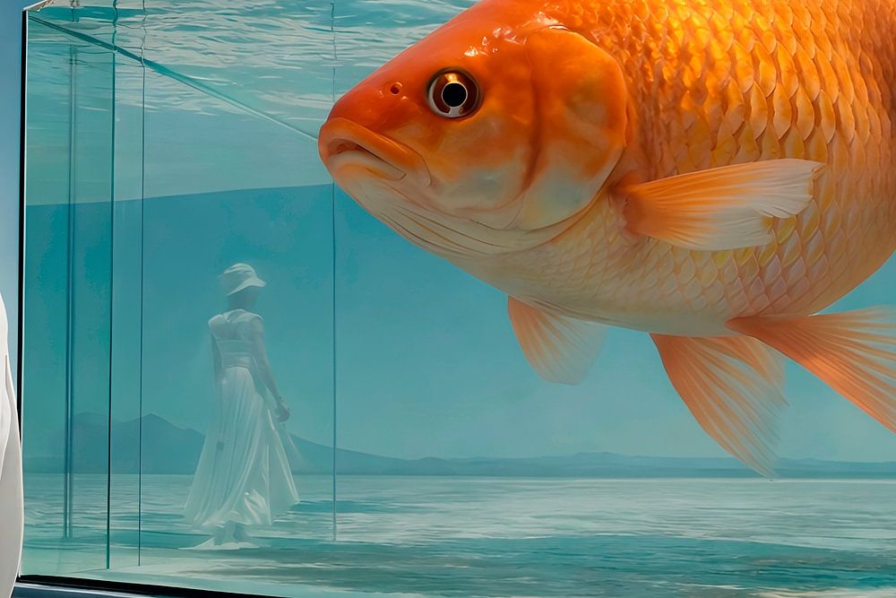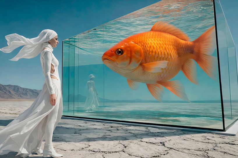 Cette œuvre d'art surréaliste met en scène une rencontre fascinante dans un paysage désertique vaste et aride. Au centre se trouve un personnage élancé, élégamment vêtu de robes fluides, debout devant un immense cube de verre. Dans ce cube nage majestueusement un poisson rouge géant, dont la présence crée une tension surréaliste. Les…