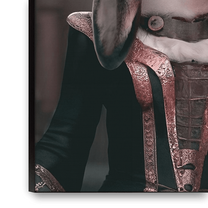 Dans un ensemble opulent qui allie l'élégance de l'époque victorienne à l'esthétique avant-gardiste du steampunk, se tient une gracieuse femme-lapin. Sa tenue est un chef-d'œuvre de mode et de technologie, une symphonie sophistiquée de métal et de pierres précieuses, sans la moindre fleur.