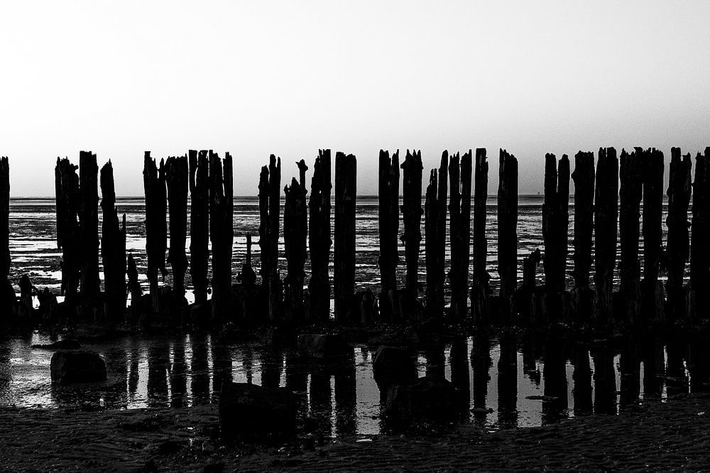 La partie la plus frappante de Moddergat est cette longue rangée de poteaux en bois dans le marais salé. En prenant des photos ici, j'ai remarqué comment le soleil couchant créait une silhouette de cette construction. Un beau moment à capturer.