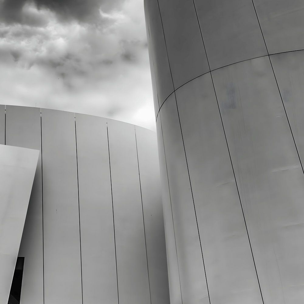Cette photo expressive en noir et blanc montre l'architecture moderne de l'Ozeaneum de Stralsund sous une perspective imposante. Les façades métalliques incurvées s'élèvent puissamment vers le ciel et ressemblent à d'immenses coques de bateau qui s'affrontent aux formations nuageuses dramatiques. Le contraste entre la surface lisse du…