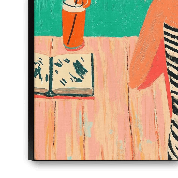 L'illustration montre une femme de dos, assise à une table en bois clair. Elle porte un large chapeau jaune avec un ruban noir et une robe sans manches à rayures noires et blanches. Ses longs cheveux sombres tombent sur ses épaules et dans son dos. A gauche, sur la table, se trouve un verre rempli d'un liquide orange et d'une paille noire. La surface du bois est visible en texture. L'arrière-plan est un turquoise uni avec des coups de pinceau verticaux qui donnent de la structure et de la profondeur. L'illustration minimaliste et plate utilise des contours clairs, des couleurs vives et une composition réduite qui met l'accent sur la femme et la boisson.