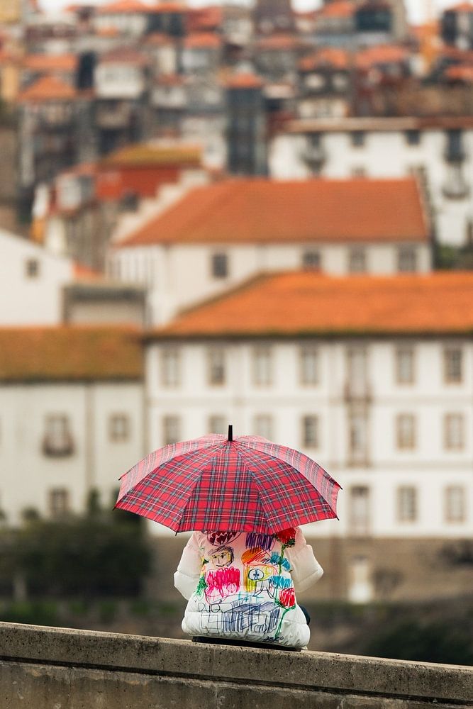 Cette photo, intitulée "Quiet Moments in Porto", capture l'essence d'un moment de calme au cœur de Porto, au Portugal. Un enfant est assis avec un sac à dos coloré et un parapluie à carreaux rouges sur un mur de béton, regardant les toits orange caractéristiques de la ville. La photo dégage un sentiment de nostalgie et de contemplation, avec la célèbre Torre dos Clérigos subtilement floue à l'arrière-plan. Les couleurs sourdes et la mise au point douce renforcent l'atmosphère sereine de cette journée pluvieuse, ce qui en fait une œuvre d'art parfaite pour les amateurs de photographie de voyage et de paysages urbains.