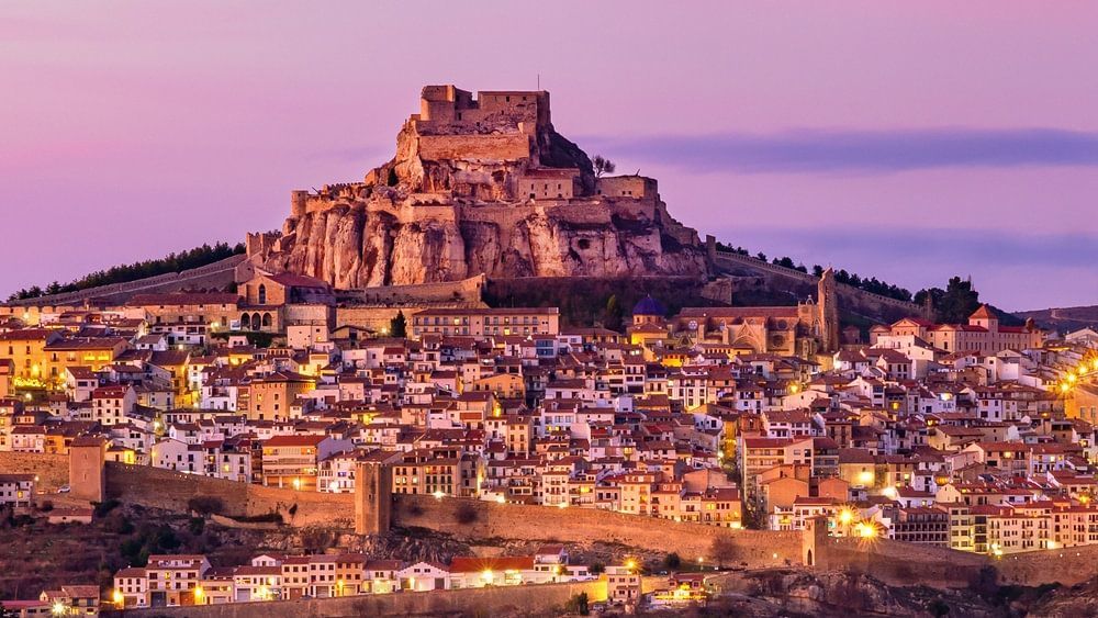 Morella est une petite ville de la région autonome de Valence en Espagne. Elle appartient à la province de Castellon. C'est une ville fortifiée stratégiquement située dans la région historique du Maestrazgo. De loin, on peut voir la ville joliment perchée sur une colline avec une vieille forteresse au sommet. Ici, nous voyons Morella lors d'un magnifique coucher de soleil.