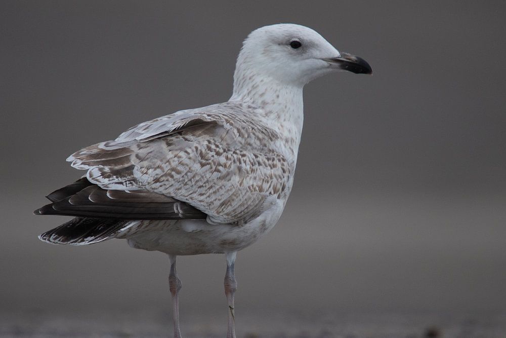 Une mouette solitaire par une journée grise. Photographié d'un point de vue bas avec un téléobjectif de 500 mm, ce qui donne à la photo un bel arrière-plan diffus.