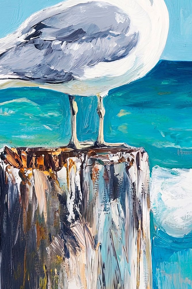 Une mouette trône majestueusement sur un poteau érodé par le temps, tandis que la mer scintillante caresse de douces vagues. Son corps d'un blanc éclatant contraste vivement avec les douces nuances de bleu du ciel et de l'eau. En arrière-plan, un voilier glisse vers la ligne d'horizon lointaine, ce qui déploie une atmosphère maritime paisible. L'instant invite à la rêverie.
