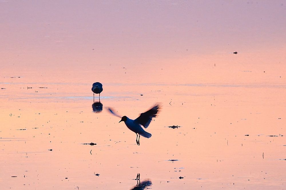Mouettes au coucher du soleil à marée basse sur la mer Baltique. Ambiance rose et rouge du soir. Mouettes en train de chercher de la nourriture dans l'eau peu profonde.