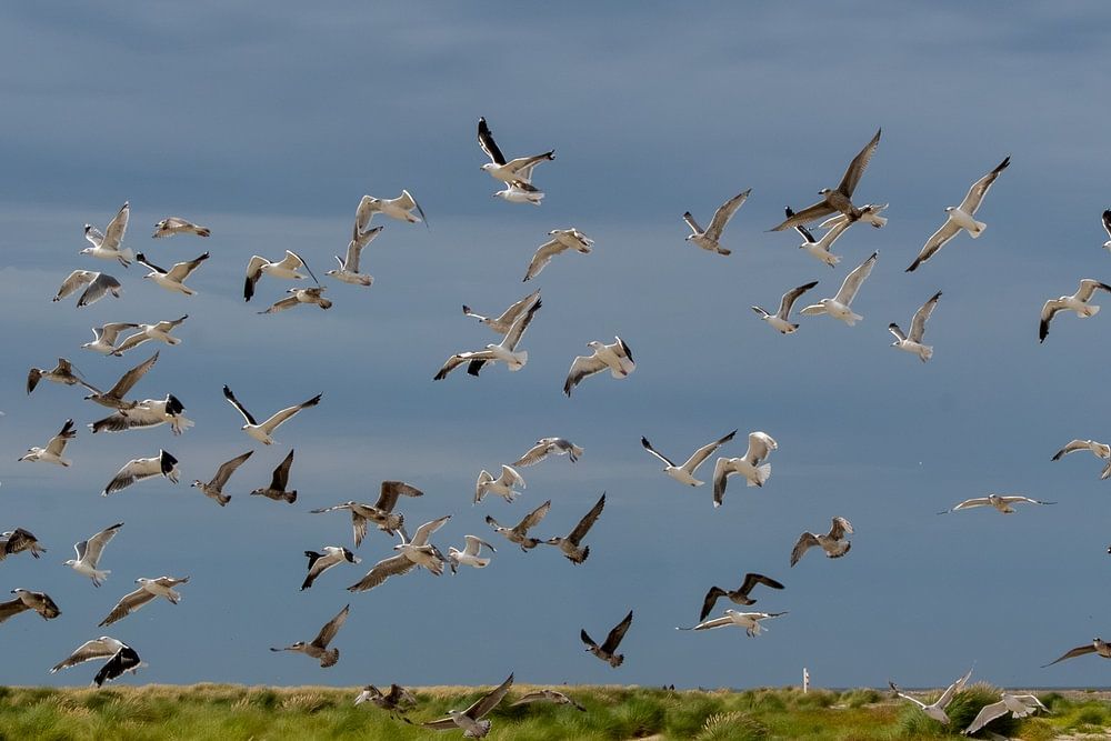 Sur la plage de Grenen, près de Skagen au Danemark, il y avait une bande de mouettes, dont certaines s'envolaient à chaque passage de personnes ou de train. Cela contrastait joliment avec le ciel sombre.