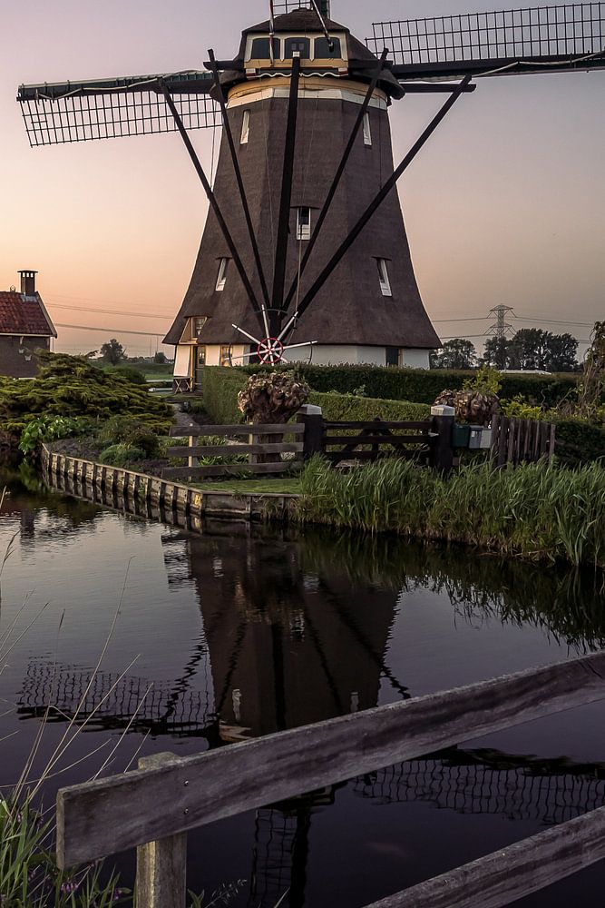 Le paysage néerlandais est plein de moulins à vent. Il n'a pas été facile d'obtenir une belle photo de chaque moulin, mais j'ai été très satisfait de cette photo. A la lumière du coucher de soleil