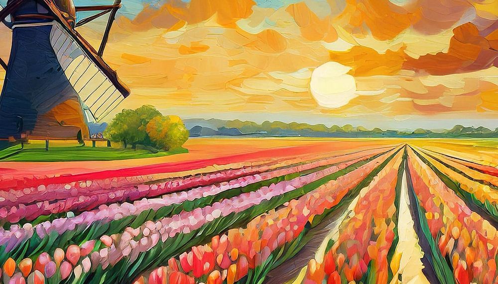 Moulin à vent dans un champ de tulipes au coucher du soleil, Pays-Bas