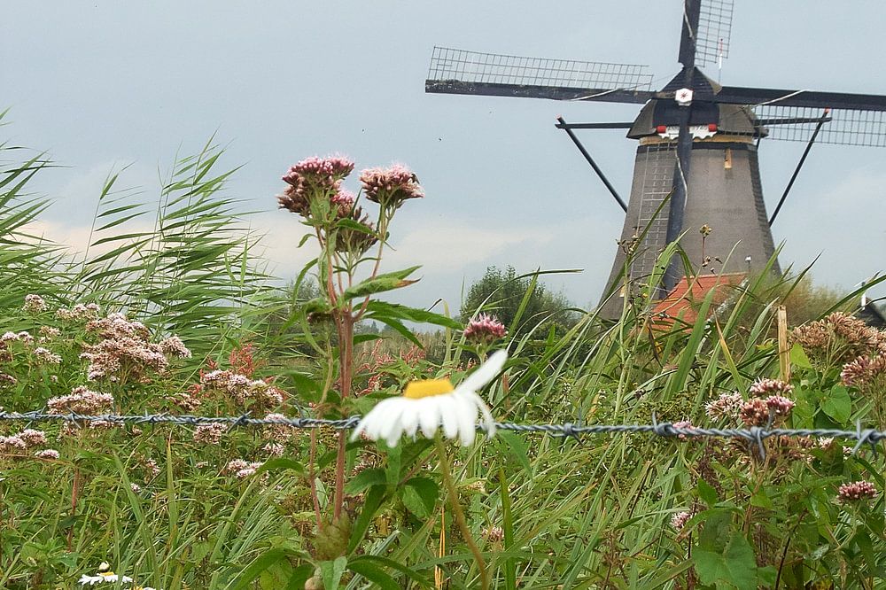 Eén van de Kinderdijk molens met op de voorgrond bloemen.