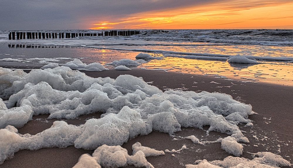 Lorsque je vais sur la côte, Mountains by the Sea reste l'un de mes endroits préférés. Surtout au coucher du soleil, on a de bonnes chances d'y être seul. Après tout, il y a une demi-heure de marche jusqu'à De Kerf. Les bollards dans l'eau et un peu plus loin les brise-lames constituent un beau sujet pour les photos de coucher de soleil. Cette fois-ci, il y avait aussi beaucoup de mousse d'algues dont j'ai fait bon usage. Cela m'a rappelé la plage de Diamond Beach en Islande, où des restes de glace s'échouent sur la plage.