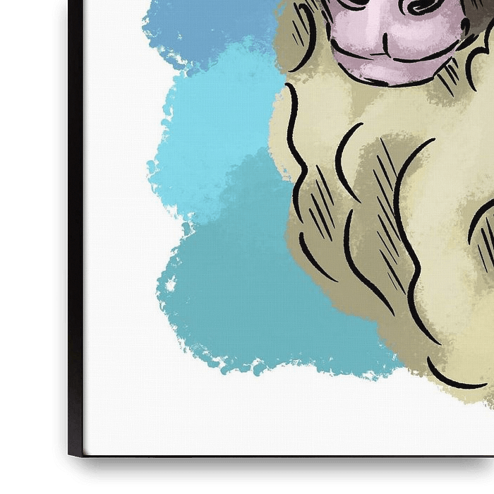 Un mouton à la tête sombre et aux grandes oreilles se détache sur un fond de coups de pinceau bleus et blancs, entouré de sa laine bouclée.