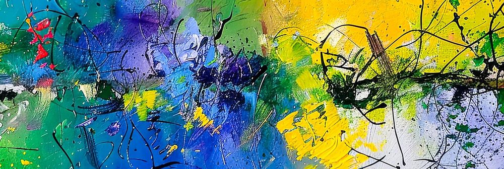 Peinture abstraite aux couleurs vives, vert, bleu, jaune, violet, lignes et éclaboussures, créant une composition pleine d'énergie. Le fond est un mélange de coups de pinceau dans différentes nuances de vert, de jaune, d'orange, de violet et de blanc, qui donnent de la profondeur à l'expérience visuelle globale. Cette œuvre d'art incarne le style artistique de l'expressionnisme avec ses traits puissants et expressifs. Elle crée une sensation de mouvement et d'énergie dans l'ensemble de la pièce.