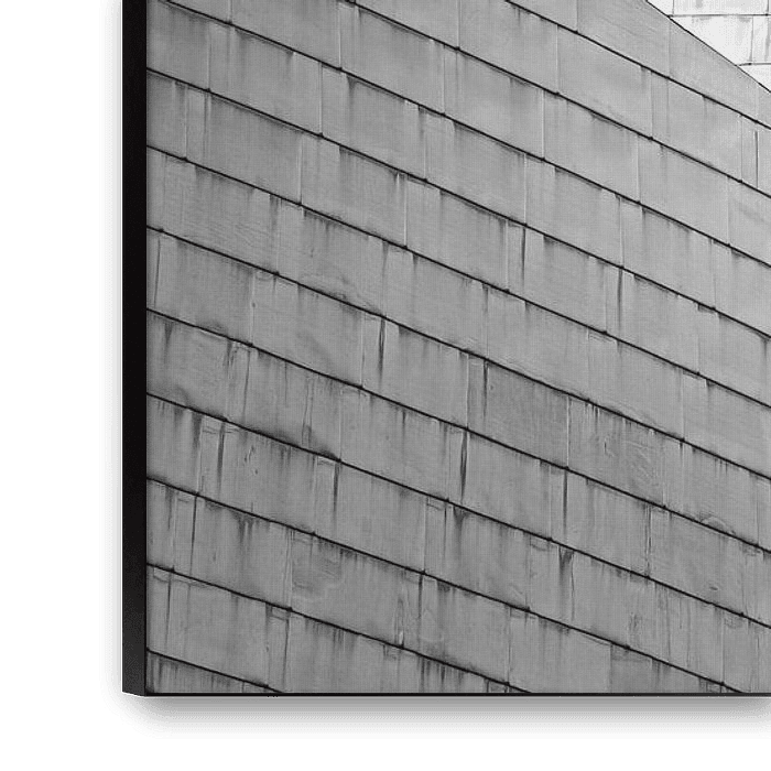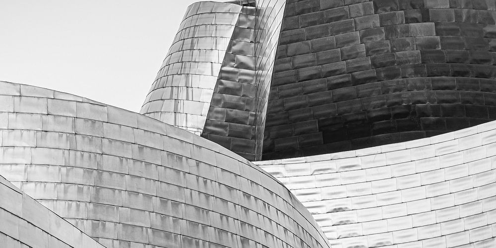 Une photo 2:1 en noir et blanc avec des détails en gros plan du célèbre musée Guggenheim dans la ville espagnole de Bilbao avec ses formes distinctes et son extérieur brillant argenté et doré lors d'un coucher de soleil par une soirée d'été.