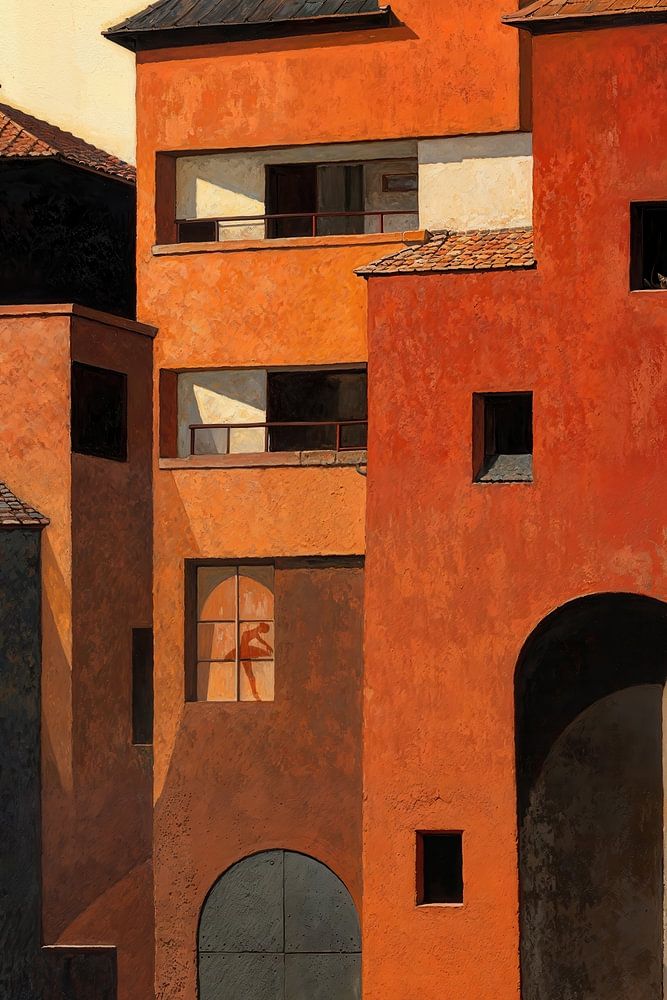 Les riches tons de terre cuite soulignent le charme rustique des bâtiments, tandis que les ombres profondes ajoutent du mystère aux coins et ruelles cachés. La silhouette d'une personne prise dans un moment de réflexion donne vie à l'endroit et invite le spectateur à poursuivre l'histoire.