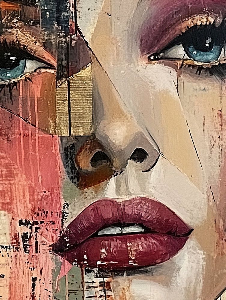 Mystère urbain doré - Cette peinture de femme montre un visage divisé en plusieurs plans abstraits avec des éléments frappants d'or et de texture, superposés à une silhouette subtile d'un paysage urbain.