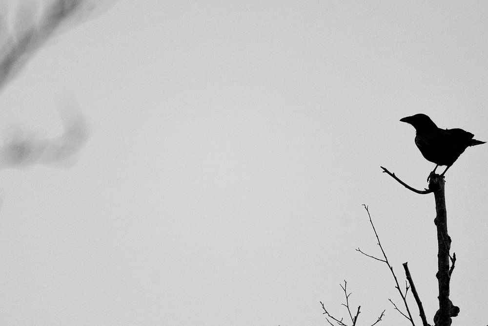 Corneille dans un arbre, mystérieuse. Noir et blanc
