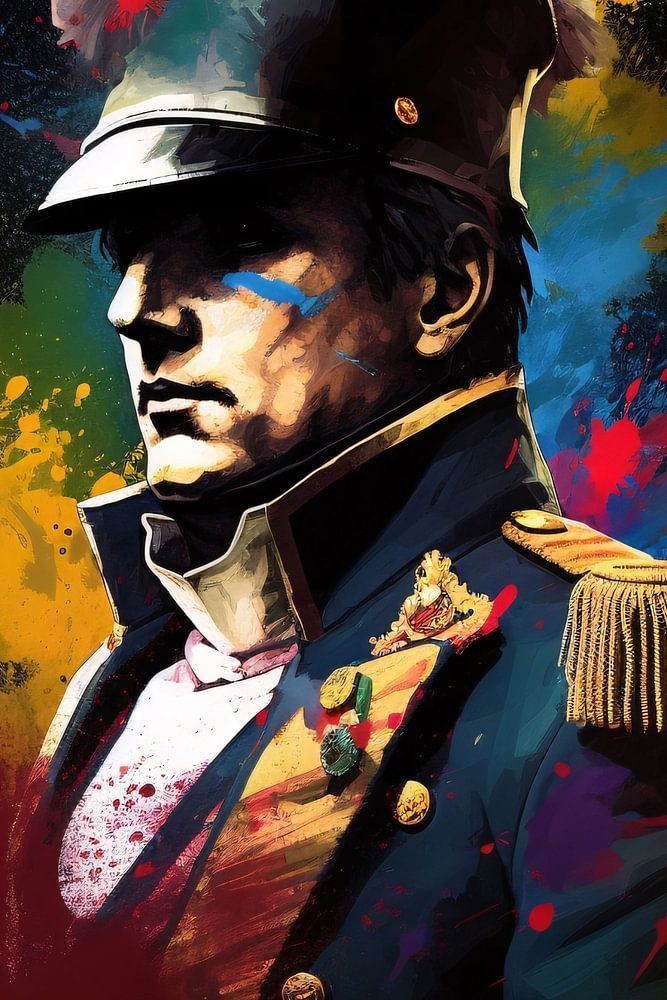 Cette œuvre d'art moderne donne vie à l'énergie et à la puissance de la grandeur historique. Des coups de pinceau puissants et une explosion de couleurs capturent une pose dramatique qui transmet à la fois la force et la vulnérabilité de son sujet. L'arrière-plan, parsemé d'éclats de couleurs vives, contraste avec les contours sombres de la figure, créant un effet dynamique qui invite le spectateur à un moment de réflexion. Cette œuvre est une ode à l'influence intemporelle des icônes historiques et à leur influence durable sur le monde moderne.