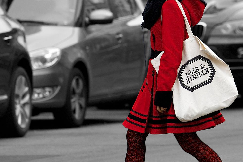 Een dame in het rood op een zebrapad, vlak bij de Nationalestraat in Antwerpen.
