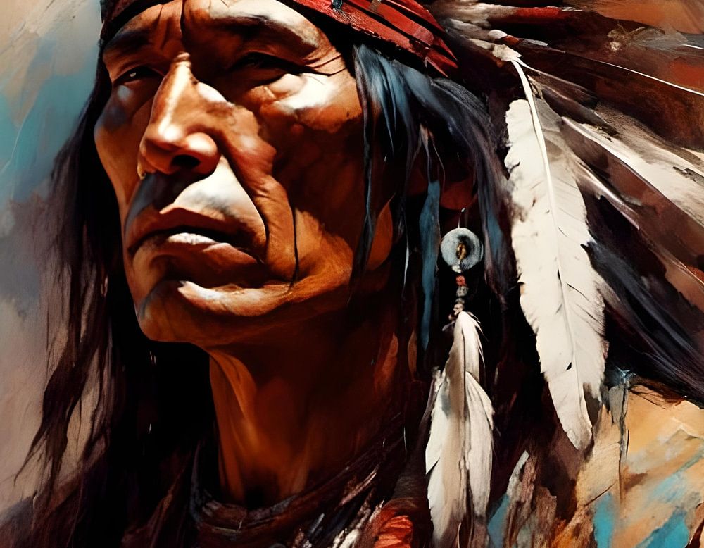 Un chef amérindien est représenté avec une expression solennelle et une coiffe traditionnelle complète. Il porte plusieurs colliers, dont un avec un pendentif en turquoise bien visible, et son visage montre des signes d'expérience et de sagesse.