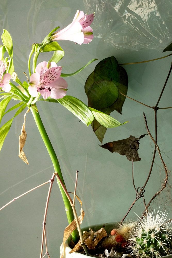 Photo verticale de nature morte d'un pot de fleurs vert tendre avec des cactus, des plantes grasses et un brin de fleurs roses et de clématites sur un morceau de papier bulle vert sur un fond vert.