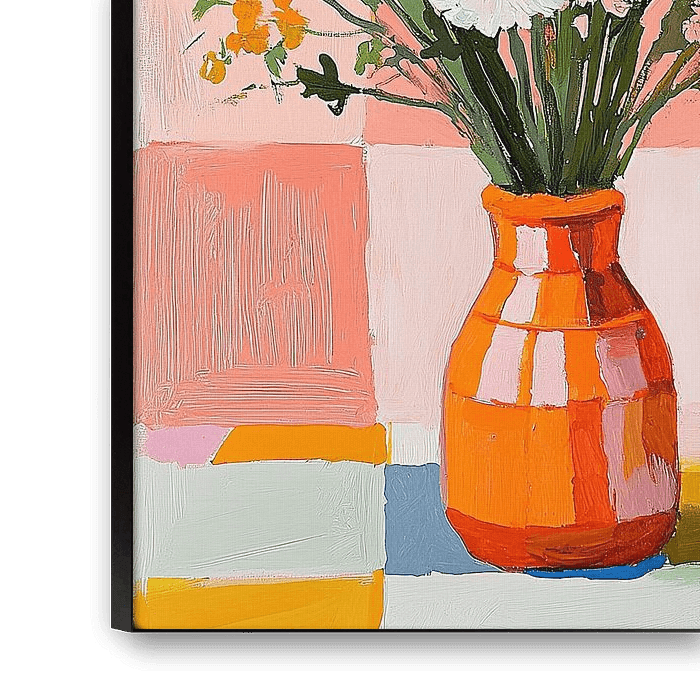 Une peinture à la gouache animée avec des fleurs sauvages dans un vase orange sur un fond de carrés roses et blancs, qui dégage de la chaleur grâce à l'utilisation de couleurs chaudes. La composition capture l'essence de la joie et de la sérénité printanières. Les coups de pinceau inspirés du style artistique minimaliste sont simples mais expressifs et donnent un sentiment de simplicité et d'élégance. C'est une œuvre d'art vivante qui évoque la joie et la fête.