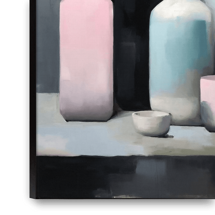 Scène abstraite avec un collage de bouteilles et de vases dans des couleurs pastel avec une couleur d'accent noir.