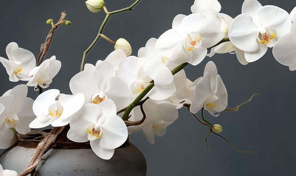 Nature morte avec des orchidées blanches dans un vase en pierre grise.