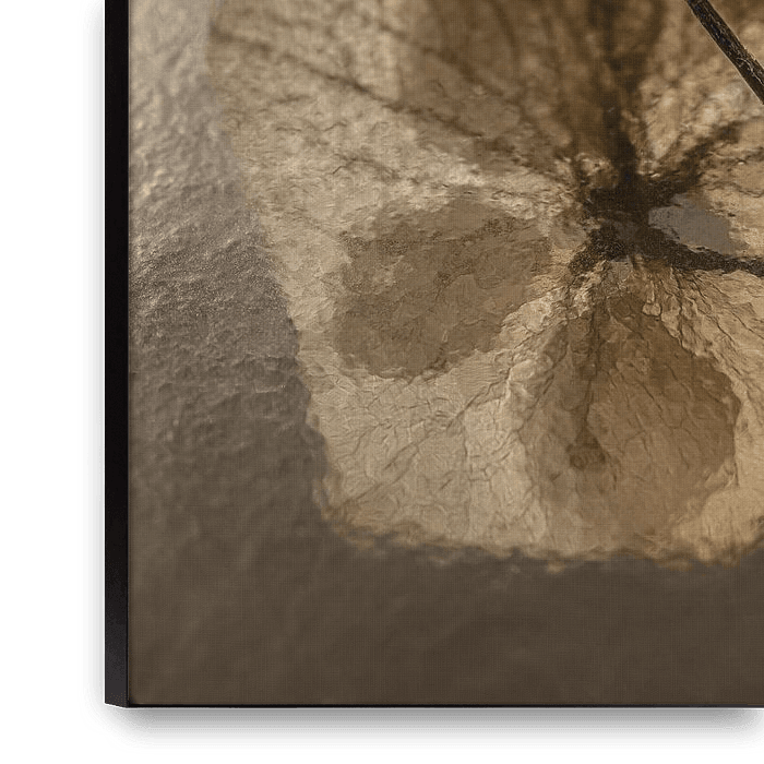 "Nature morte avec fleurs en taupe : La feuille d'hortensia dans la lumière" est une photo macro d'une feuille d'hortensia qui s'est déjà partiellement décomposée, ce qui permet de voir magnifiquement la structure des veines de la feuille. Si vous zoomez sur l'œuvre, vous pouvez bien voir la structure des nervures sur les deux feuilles supérieures. Les feuilles sont très fragiles et minces, ce qui fait ressortir les veines. Les couleurs donnent à cette œuvre un aspect chaleureux. Les nombreuses nuances de brun (gris, beige, taupe et parfois presque doré), entre autres, y contribuent. Le fond est gris-brun et la feuille s'y reflète. Pour cette photo, j'ai opté pour une faible profondeur de champ. Plus on regarde vers l'arrière, plus la feuille devient floue. Ce phénomène (associé à l'éclairage) crée de la profondeur dans l'œuvre. La feuille repose sur une surface réfléchissante qui a une texture. Par conséquent, il n'y a pas d'ombre serrée, mais un reflet presque pictural.