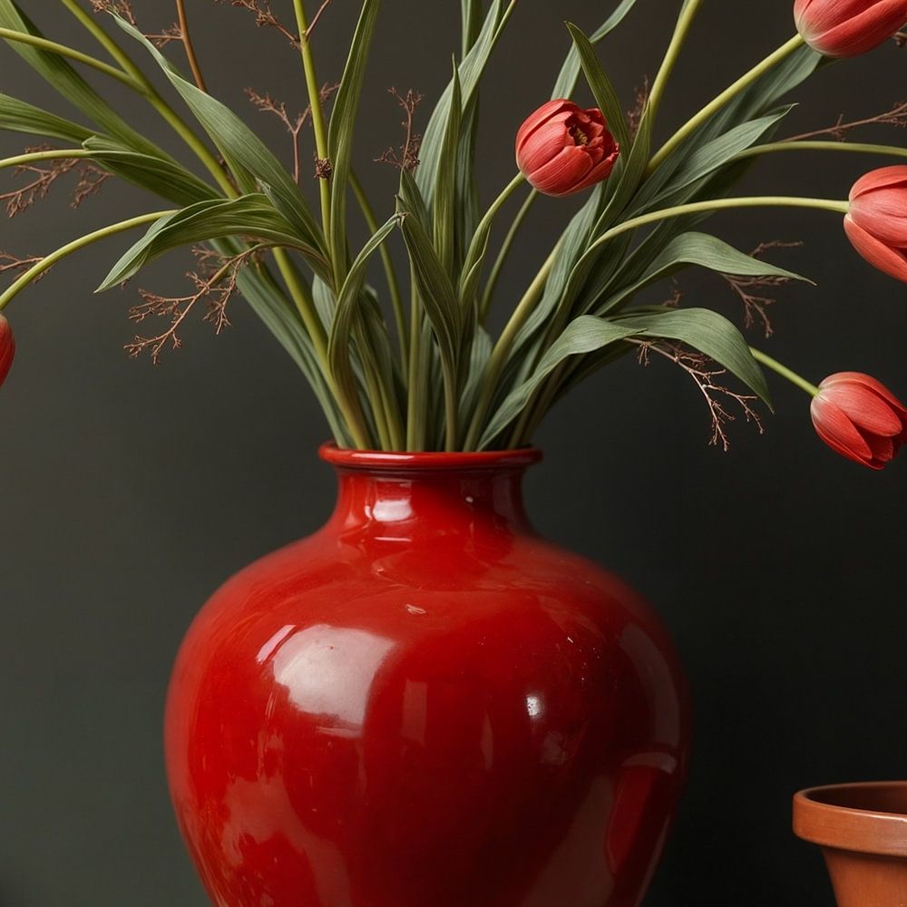 La peinture représente une nature morte d'un vase rouge avec des tulipes rouges et des brindilles délicates, placé sur une vieille étagère murale en bois. Les couleurs profondes des fleurs contrastent avec l'étagère usée par le temps et l'arrière-plan sombre. La lumière capture subtilement les textures, créant une atmosphère intime et intemporelle.